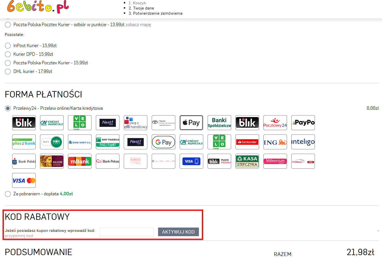 Wybierz to, czego potrzebujesz: pieluszki, mleko modyfikowane, kosmetyki, ubranka lub zabawki. Dodaj wszystko do koszyka i przejdź do finalizacji zamówienia. W formularzu zamówienia znajdziesz pole do wpisania kodu promocyjnego. Wklej lub wpisz tam kupon z Tipli i zatwierdź – rabat zostanie automatycznie odjęty od kwoty do zapłaty.
