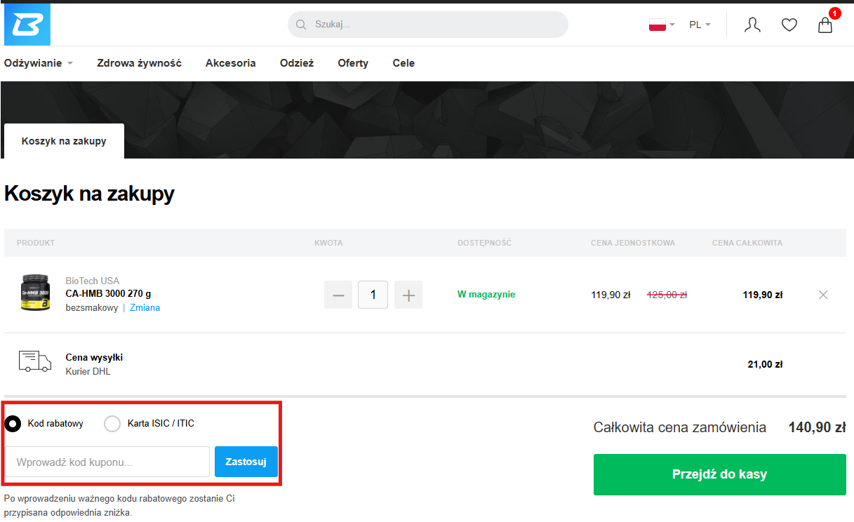 Dodaj do koszyka produkty, które chcesz kupić – mogą to być suplementy, odżywki białkowe, witaminy, shakery, a nawet odzież sportowa. Gdy już wszystko wybierzesz, przejdź do realizacji zamówienia. W koszyku znajdziesz pole na wpisanie kodu rabatowego. Wklej tam wcześniej skopiowany kod z Tipli i zatwierdź. Od razu zobaczysz, o ile obniżyła się wartość Twojego zamówienia.