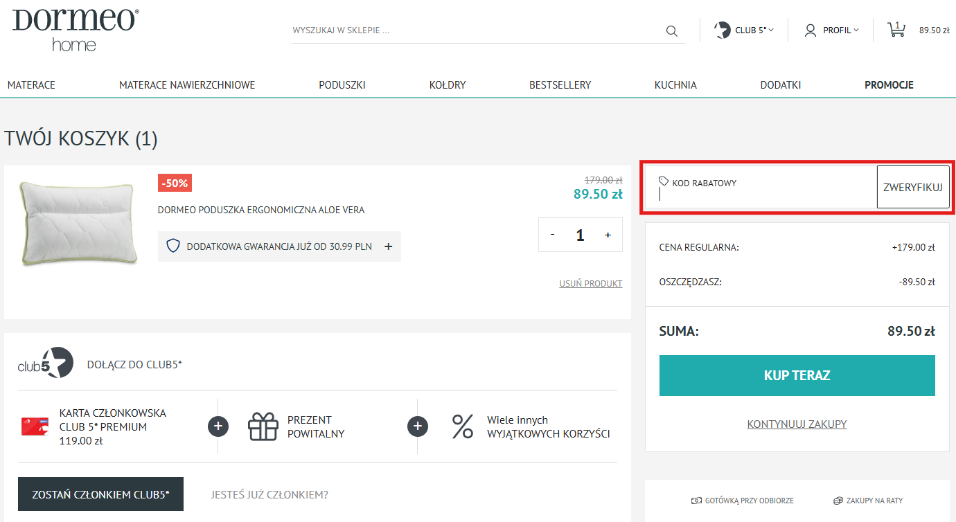 Znajdź idealny materac, poduszkę ortopedyczną, pościel z mikrowłókien albo nowoczesny topper. Dodaj wszystko do koszyka. Upewnij się, że wybrane produkty objęte są promocją – niektóre kody rabatowe mają ograniczenia. W formularzu zamówienia znajdziesz pole na kod rabatowy. Wklej tam wcześniej skopiowany kupon i kliknij „Zweryfikuj”. System automatycznie obniży kwotę do zapłaty.