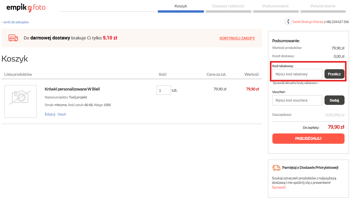 Dodaj gotowe produkty do koszyka, gdy projektowanie będzie zakończone. Przejdź do podsumowania zakupów. W koszyku znajdziesz pole „Kod rabatowy” – to tam należy wkleić wcześniej skopiowany kupon z Tipli. Kliknij „Przelicz”, a rabat zostanie natychmiast naliczony – zobaczysz obniżoną cenę końcową.