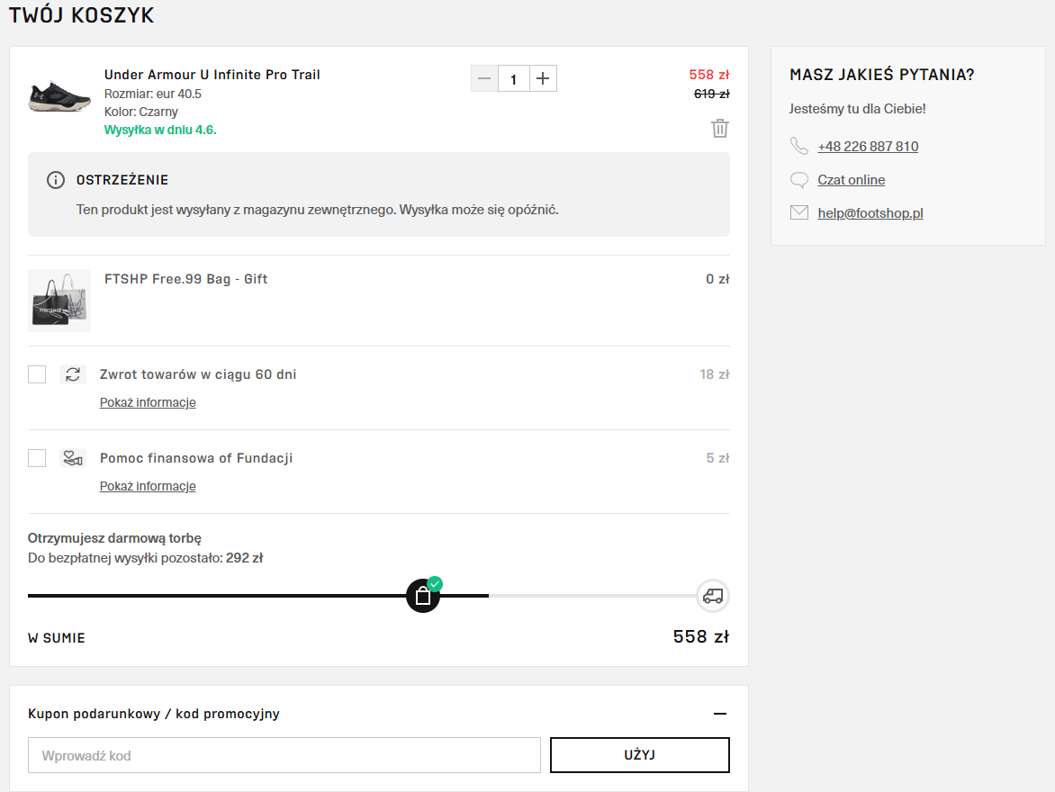 Na etapie podsumowania zamówienia znajdziesz pole oznaczone jako „Kod promocyjny”. Wklej tam swój kupon i zatwierdź – cena zamówienia zostanie natychmiast obniżona.