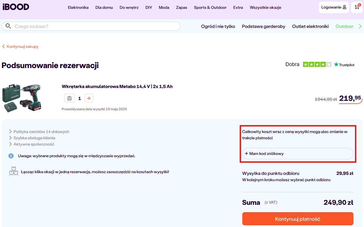 Jeśli dostępny jest kod promocyjny, kliknij i skopiuj go – przyda się podczas składania zamówienia. Przejrzyj aktualne promocje – większość z nich to oferty ograniczone czasowo lub ilościowo, więc nie zwlekaj z decyzją. Gdy znajdziesz coś dla siebie – np. powerbank, zestaw narzędzi Bosch, ekspres do kawy czy akcesoria smart home – dodaj produkt do koszyka.