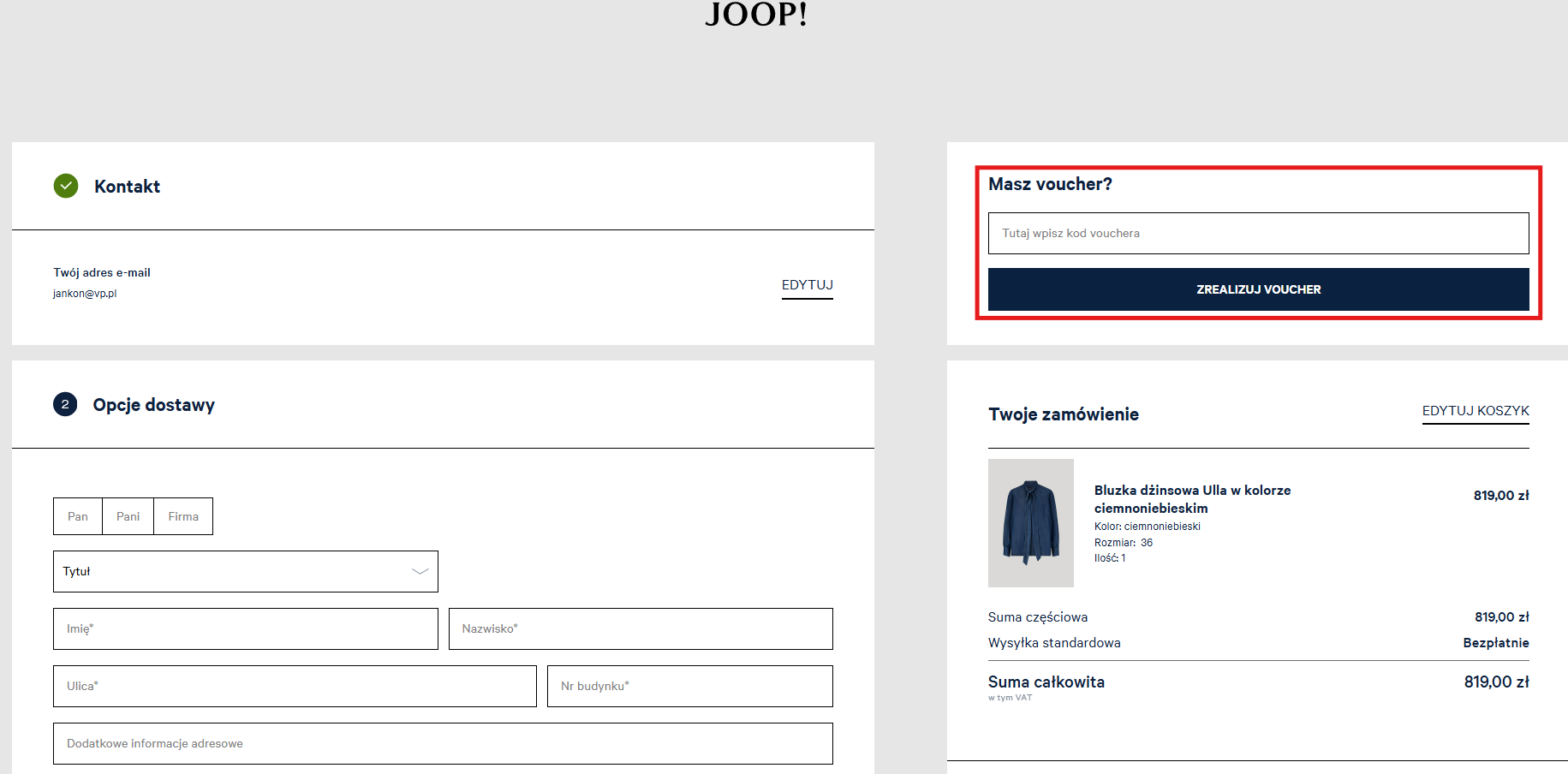 Kliknij, aby skopiować kod i przejdź do sklepu. Na stronie sklepu JOOP zacznij kompletować swój idealny zestaw – koszule, marynarki, sukienki czy torebki. Dodaj wybrane artykuły do koszyka i przejdź do realizacji zamówienia.