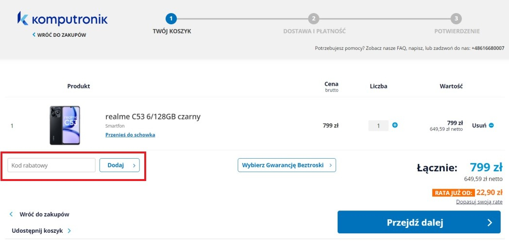 Następnie, wpisz Komputronik kod rabatowy w koszyku i kliknij „Dodaj”. Rabat zostanie naliczony automatycznie.