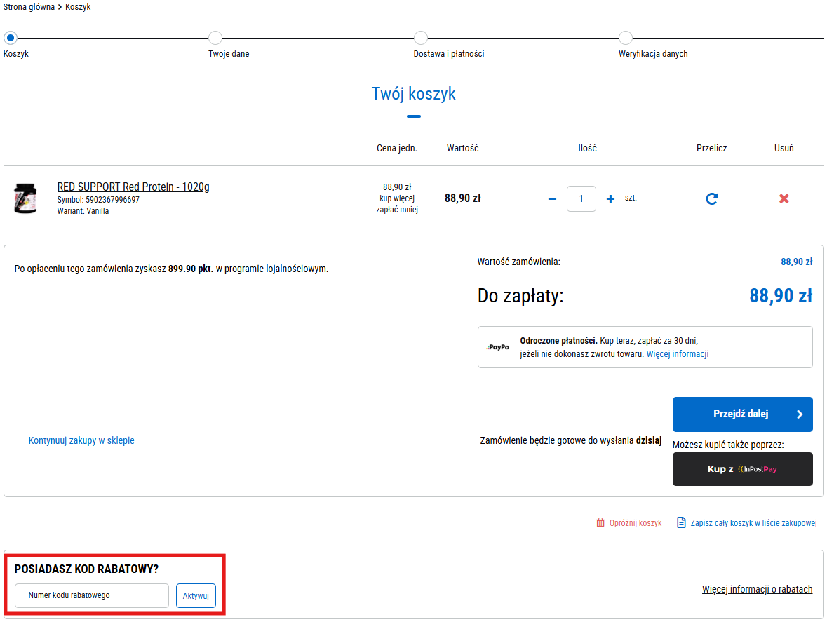 Zrób zakupy jak zwykle – wybierz suplementy, witaminy, odzież sportową czy akcesoria treningowe i dodaj je do koszyka. Podczas składania zamówienia znajdziesz specjalne pole na kod promocyjny. Wklej tam kod skopiowany z Tipli i zatwierdź – wartość koszyka automatycznie się obniży.