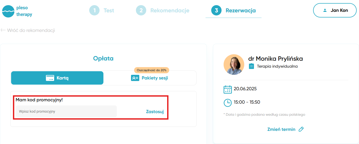 Na etapie opłacania wizyty znajdziesz pole na kod promocyjny. Wklej swój kupon z Tipli i zatwierdź – system natychmiast naliczy zniżkę. Cena spotkania zostanie obniżona, a Ty będziesz mógł kontynuować rezerwację.
