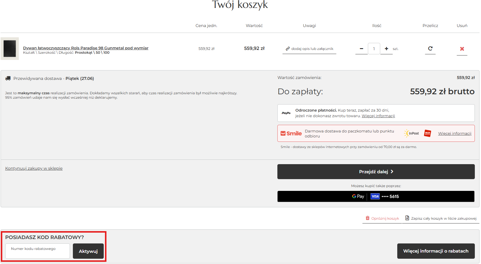 Po zakończeniu zakupów przejdź do realizacji zamówienia. W formularzu podsumowania znajdziesz pole przeznaczone na kod promocyjny. Wklej tam wcześniej skopiowany kod i kliknij „Aktywuj”. Jeśli kod jest ważny i spełnione są warunki promocji, rabat zostanie od razu uwzględniony.
