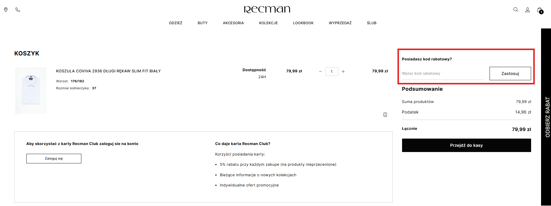 Jeśli przy wybranej promocji widnieje kod to skopiuj go. Następnie przejdź do sklepu internetowego Recman. Przeglądaj ofertę sklepu i wybierz ubrania, buty lub akcesoria, które chcesz kupić. Gdy będziesz gotowy, dodaj wybrane produkty do koszyka.