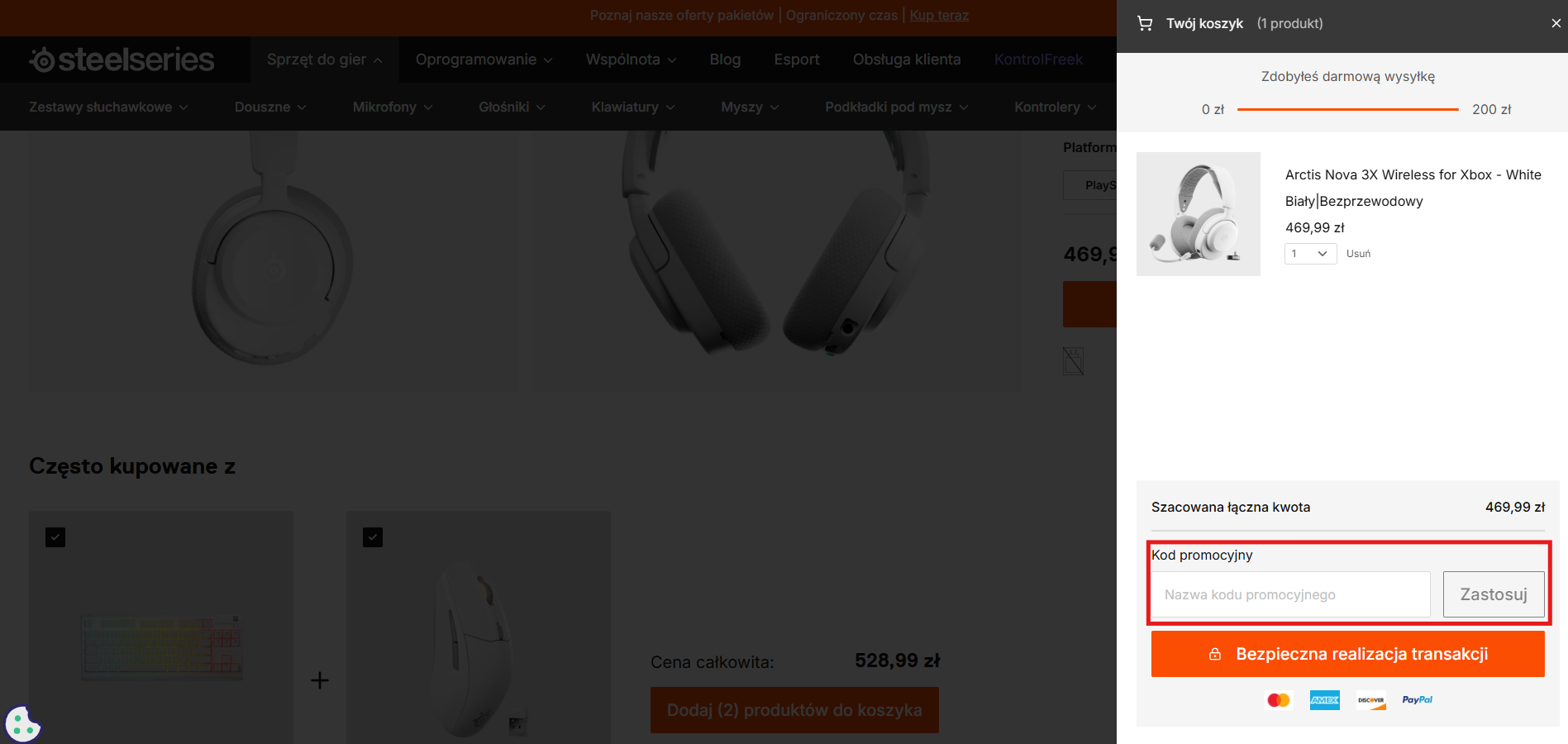W sklepie SteelSeries wybierz akcesoria gamingowe, które Cię interesują – mogą to być słuchawki, myszka, klawiatura czy inny sprzęt. Dodaj wszystko do koszyka i przejdź do finalizacji zamówienia. Na podsumowania zamówienia znajdziesz specjalne pole na wpisanie kodu promocyjnego. Wklej tam skopiowany kod z Tipli i zatwierdź – zobaczysz, jak cena automatycznie się obniży.