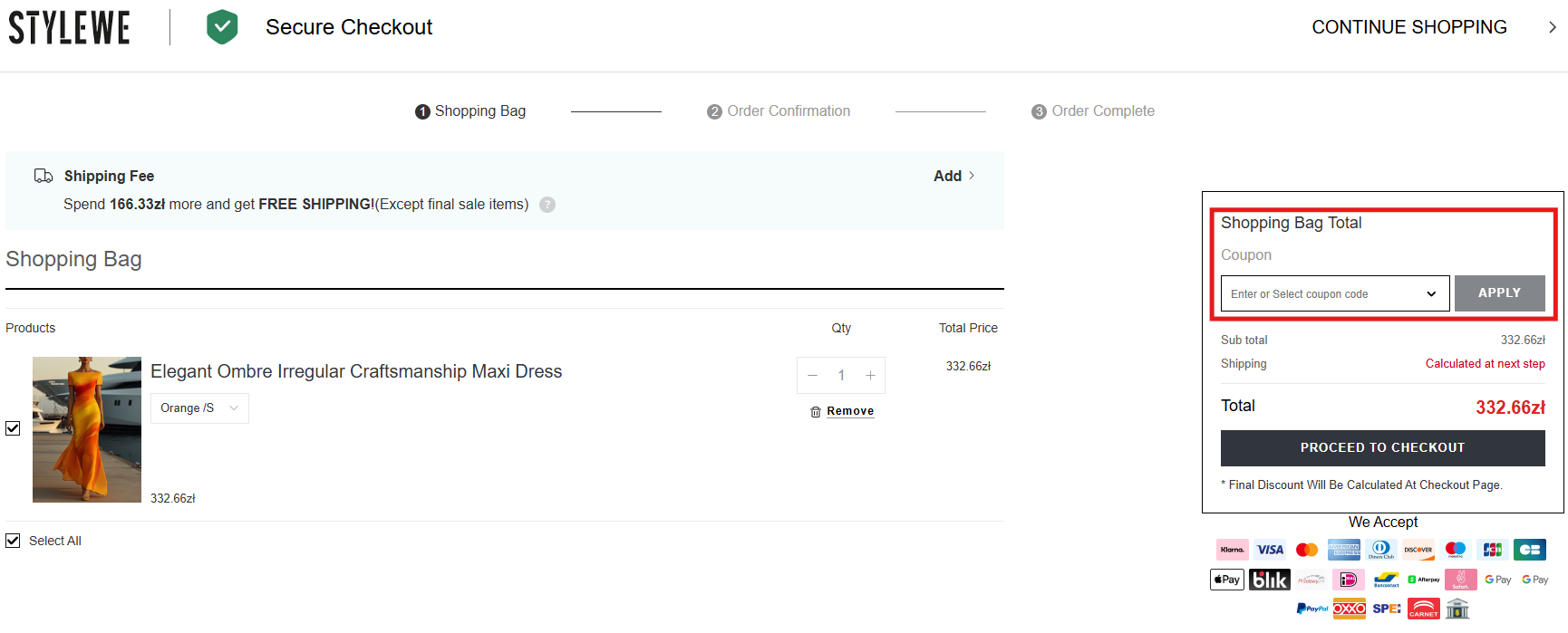 Gdy przejdziesz do podsumowania zakupów, znajdziesz pole oznaczone jako „Coupon Code”. Wklej tam wcześniej skopiowany kod z Tipli i kliknij „Apply”. Od razu zobaczysz, o ile została obniżona cena Twojego zamówienia.