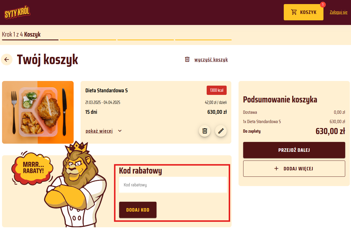 Skopiuj kupon lub zapisz go, żeby mieć go pod ręką. Przejdź na stronę SytyKrol.pl i wybierz odpowiednią dietę – klasyczną, wegetariańską, sportową lub inną dostępną opcję. Określ liczbę dni, kaloryczność oraz miejsce dostawy, a następnie dodaj wybraną dietę do koszyka.