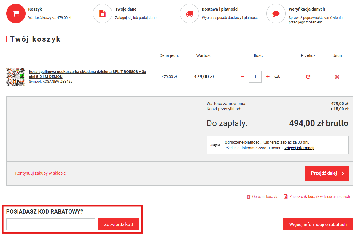 W podsumowaniu zamówienia znajdziesz pole na kod promocyjny. Wklej tam wcześniej skopiowany kupon i zatwierdź – cena automatycznie się obniży, jeśli kod jest nadal aktywny i spełniasz warunki promocji.