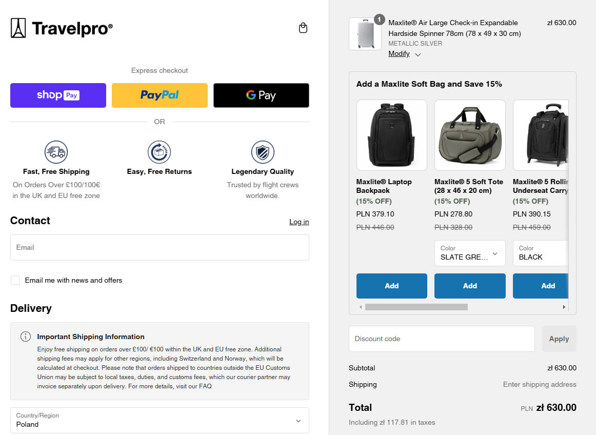 Kliknij przycisk „Kup teraz” na Tipli.pl, aby przejść na stronę Travelpro z aktywnym cashbackiem. Wybierz produkty i zrób zakupy. Dodaj do koszyka wybrane walizki, plecaki lub inne akcesoria podróżne, które chcesz zakupić.