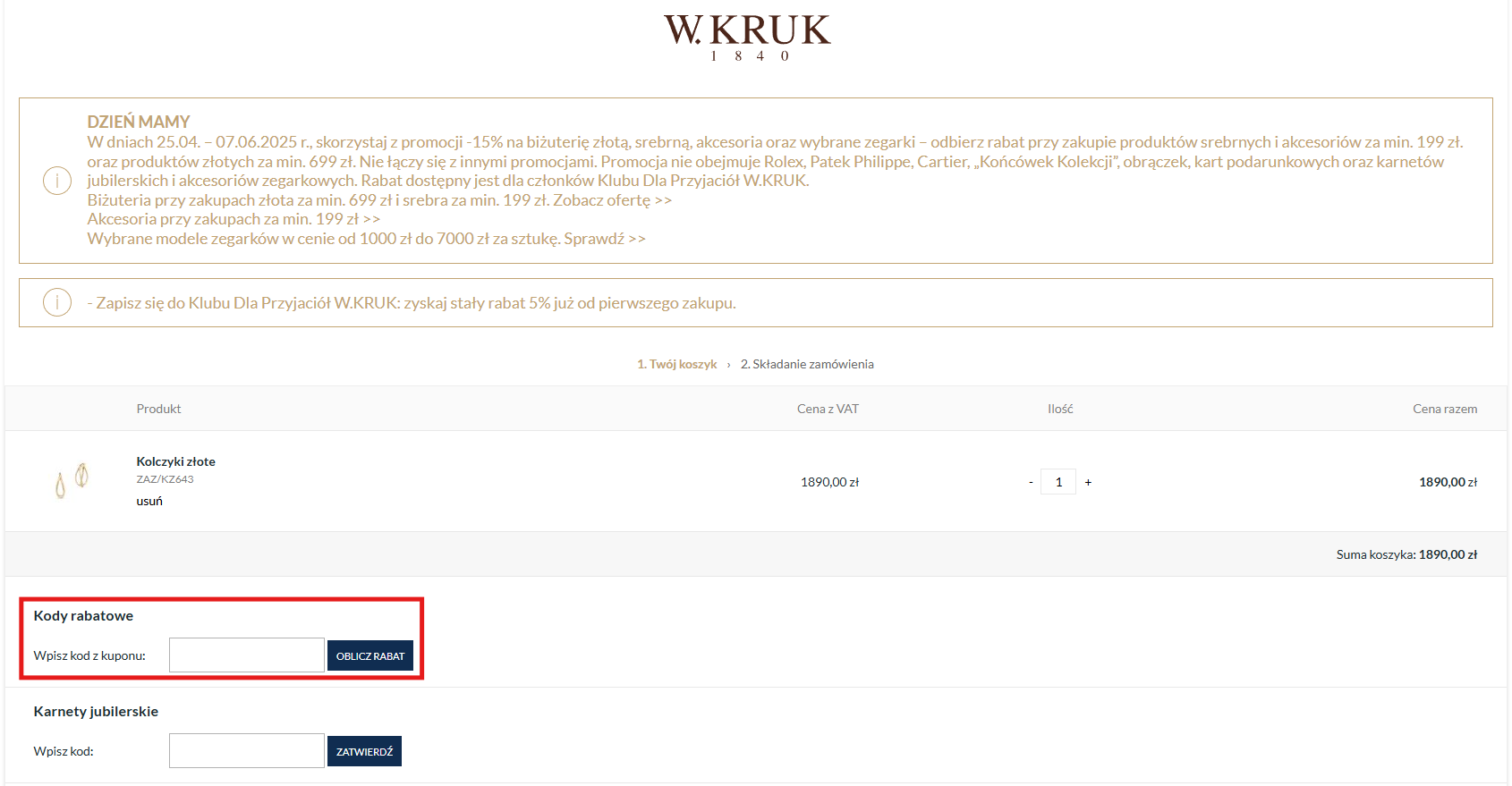 Kliknij kod i go skopiuj do schowka. Następnie przejdź do sklepu korzystając z przekierowania od Tipli. Na stronie wkruk.pl możesz spokojnie przeglądać ofertę i wybierać biżuterię, która Cię zachwyci – kolczyki, bransoletki, zegarki, naszyjniki czy pierścionki zaręczynowe. Kiedy wszystko będzie gotowe, przejdź do koszyka.