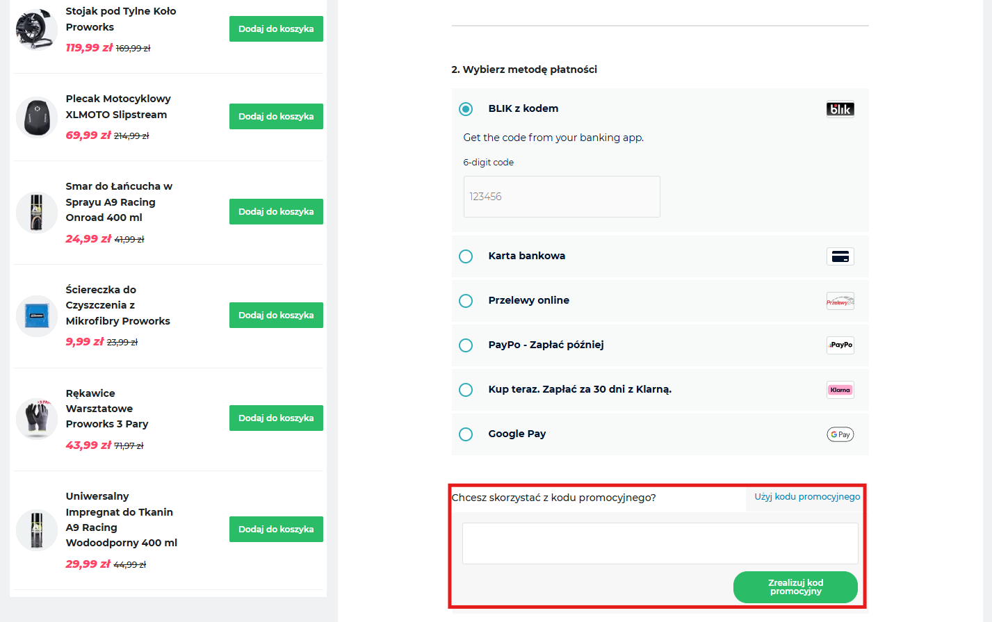 Wybierz interesujące Cię produkty – może to być nowy kask, zestaw odzieży, opony czy części techniczne. Gdy skończysz kompletować zamówienie, przejdź do koszyka. W formularzu zamówienia znajdziesz specjalne pole na kod promocyjny. Wklej tam swój kod i kliknij „Zrealizuj kod promocyjny” – rabat naliczy się automatycznie.